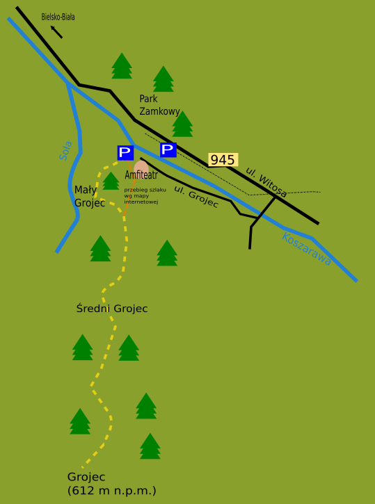Dojazd: Do Żywca dojeżdżamy drogą ekspresową S1 i kierujemy się na centrum. Na rondzie przy McDonald’s jedziemy prosto, a na kolejnym skręcamy w prawo (trzeba wybrać prawy pas, który poprowadzi nas na drogę 945). Kolejne rondo przejeżdżamy prosto i ok. 400 metrów za nim już można rozglądać się za miejscem parkingowym: po prawej znajduje się spora zatoka parkingowa. Na przeciwko – wejście do Parku Zamkowego od strony Mini Zoo, a po stronie parkingu, za torami – ścieżka dydaktyczna wzdłuż Koszarawy i Amfiteatr. Kto chce dojechać pod sam początek szlaku, musi jechać dalej, na rondzie wybrać pierwszy zjazd (kontynuować drogą 945), z następnie tuż za przejazdem kolejowym skręcić w prawo na most. Za mostem skręcamy w prawo w ul. Grojec, a na rozwidleniu znów trzymamy się prawej. Jedziemy do końca (uwaga na kilka progów zwalniających), aż na parking przy amfiteatrze.