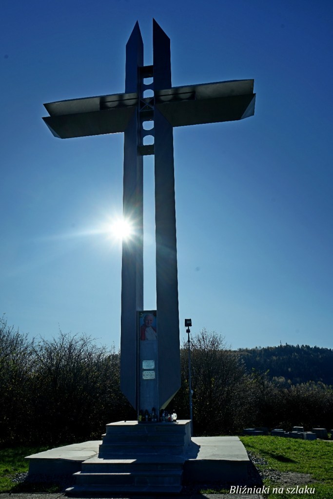 Teraz szlak jest łagodniejszy, idziemy wśród łąk i pól w stronę Średniego Grojca. Najpierw mijamy po lewej stok, przez który według niektórych map ma prowadzić szlak, następnie idziemy polną drogą – trzymajmy się jej cały czas, ponieważ tutaj nie ma oznaczeń szlaku. Co chwila obracamy się za siebie i rozglądamy się wokół, by zobaczyć za sobą widok na Jezioro Żywieckie i Beskid Mały, Beskid Żywiecki po lewej i Beskid Śląski po prawej. W końcu docieramy do szerszej drogi, skręcamy nią w prawo, do góry – stąd widać już krzyż na Średnim Grojcu. Droga ta obecnie jest w trakcie budowy, jest więc mocno błotniście w tym miejscu, a prowadzi tędy szlak Drogi Krzyżowej, o którym nieco wspomniane będzie dalej. W końcu docieramy na Średni Grojec – stąd roztaczają się najpiękniejsze widoki w trakcie całej wycieczki, lepiej już nie będzie, bo najwyższy wierzchołek Grojca otoczony jest drzewami i widok nie jest już tak imponujący. Z Kopca, bo tak też jest nazywany Średni Grojec, widzimy Jezioro Żywieckie i Beskid Mały, a także Beskid Śląski. Znajduje się tutaj krzyż, postawiony na pamiątkę wizyty Jana Pawła II w Żywcu w 1995 r. Tuż obok przygotowane jest miejsce na ognisko, otoczone kamiennymi miejscami do siedzenia.