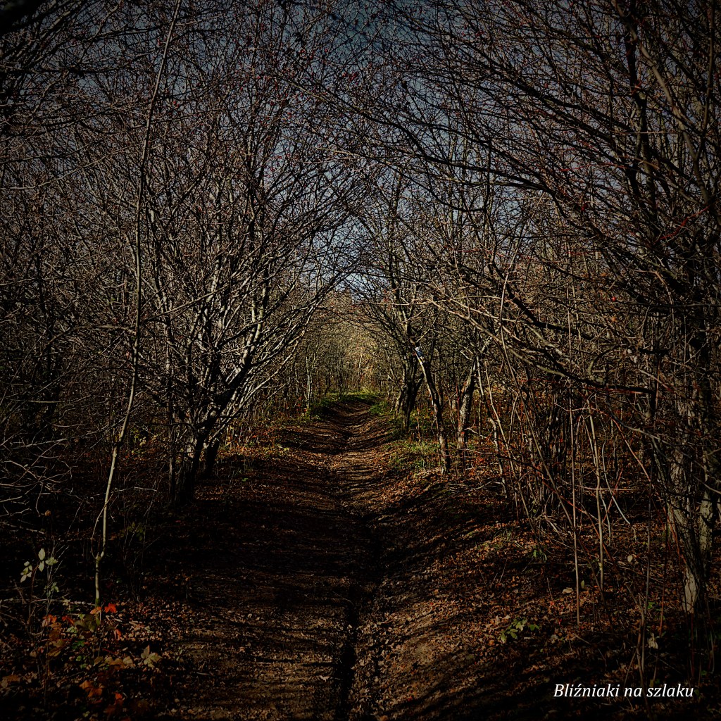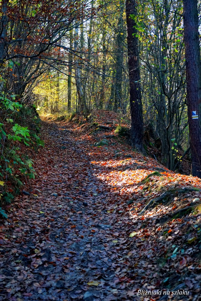 Za miejscem na ognisko ścieżka prowadzi dalej w dół, wśród krzewów dzikich róż. Ciekawie musi tu wyglądać latem, kiedy te wszystkie krzewy kwitną, ale pewnie jest też mnóstwo owadów. Dalej ścieżka jeszcze jakiś czas obniża się, potem wypłaszcza, prowadząc po dość wilgotnym, błotnistym jesienią terenie. W końcu czeka nas ostatnie podejście na Grojec. Początkowo ścieżka jest wąska, ostro biegnąca w górę, częściowo kamienista, częściowo błotnista, a częściowo jesienią usłana liśćmi – ten odcinek nie jest zbyt wygodny, szczególnie na wycieczce z młodszymi dziećmi. Następnie ścieżka rozszerza się i nieco wypłaszcza, po kilkunastu minutach docieramy na szczyt Grojca. Dalej wędrując żółtym szlakiem można dojść do Browaru w Żywcu.