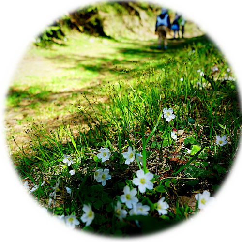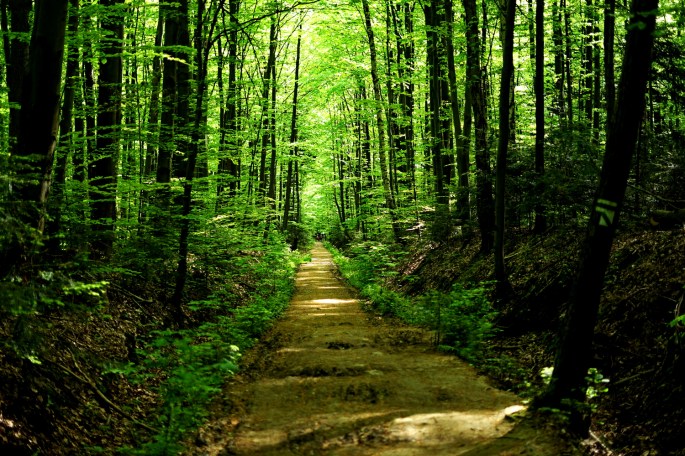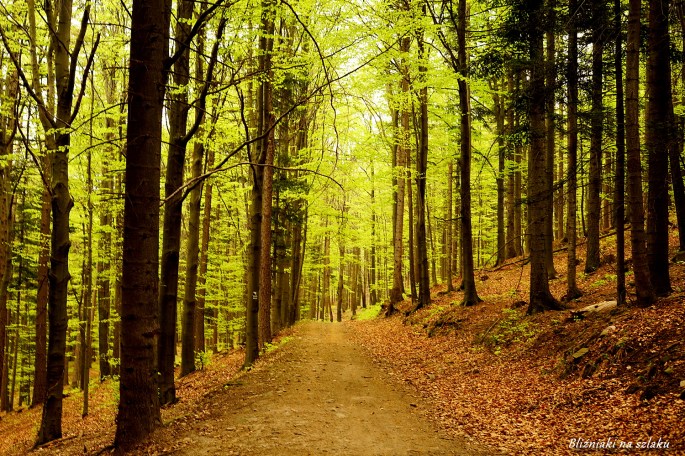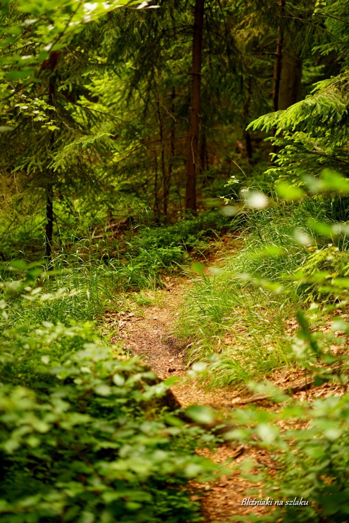Wracamy tą samą drogą do szlaku i skręcamy do lasu. Czeka nas teraz krótki odcinek bardzo wąskiej ścieżki przez las, następnie niedługi fragment szerokiej drogi w buczynie, a następnie znów fragment bardzo wąską ścieżką, tym razem bardziej otwartym terenem wśród trawy. Ze względu na fakt, iż szlak jest rzadko uczęszczany i trawy dość bujnie tutaj rosną, warto przed wycieczką sięgnąć po środek odstraszający kleszcze.