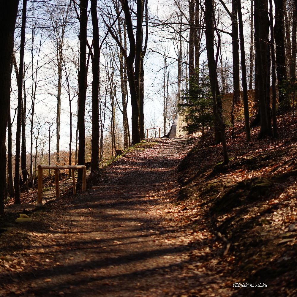 Na wycieczkę wyruszyliśmy z parkingu na końcu ul. Piaskowej, u stóp Kamieniołomu w Kozach – przy okazji tej wycieczki, warto odwiedzić również to miejsce, które znajduje się parę kroków stąd, a o którym szerzej przeczytacie w odrębnym wpisie dotyczącym Kamieniołomu w Kozach – tutaj. Na naszą wycieczkę natomiast ruszamy wracając się do wjazdu na parking, przechodzimy przez ulicę i mijając szlaban, wchodzimy do lasu. Idziemy prosto, szeroką leśną drogą, przez ok. 1 km, aż do skrzyżowania ze szlakiem niebieskim. Po drodze mijamy dwa leśne stawy: Wilczy Staw i Nowy Wilczy Staw, o których można przeczytać we wpisie o spacerze do tych stawów – tutaj. Docieramy do skrzyżowania z niebieskim szlakiem – tutaj skręcamy w prawo i kontynuujemy wędrówkę szlakiem niebieskim. Na początku pnie się on dość mocno w górę, ale po ok. 500 m wspinania się, lekko skręca w lewo i łagodnieje. Teraz po niemalże płaskiej trasie trawersuje zbocze. Mamy do przejścia kolejne 2 km tym szlakiem, po drodze mijamy odsłonięcie fliszu karpackiego i dwa punkty widokowe. Z trasy można zejść za znakami także do ruin zamku Wołek, o których przeczytać można tutaj. Szlak miejscami przecinają drobne cieki wodne, momentami jest więc wilgotno, błotniście i trzeba przekroczyć drobne strumyki. Przy wędrówce z dziećmi uwaga też na ekspozycję po lewej, która momentami jest spora.