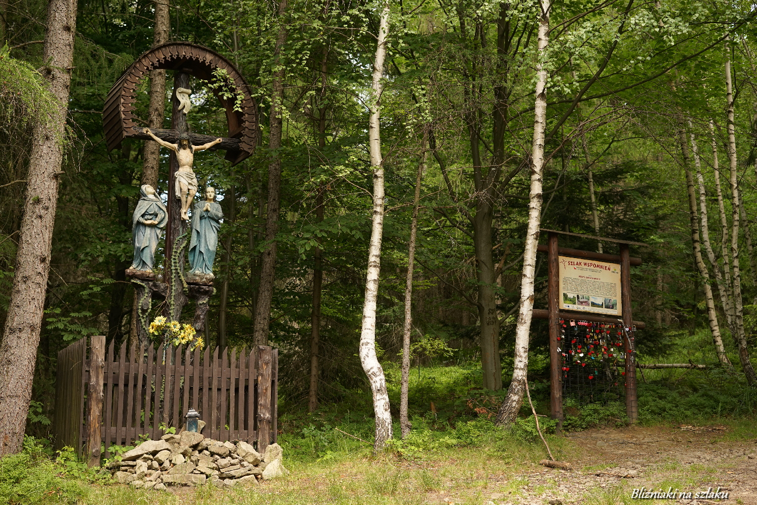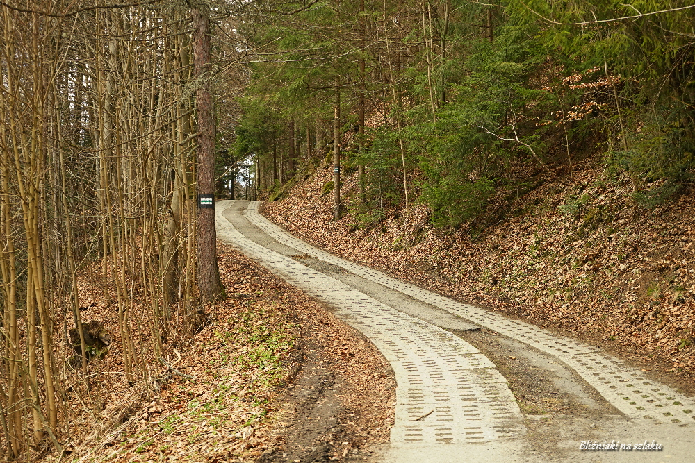 Tym razem szukamy oznaczeń biało-czerwonych kwadratów, oznaczonego tak Szlaku Wspomnień. (My rozpoczęliśmy wędrówkę od bardziej stromego podejścia, bo wolimy mieć je na wyjście niż na zejście, musieliśmy się więc wrócić asfaltem do początku szlaku. Trasą można zrobić w odwrotnym kierunku, wówczas na koniec zostanie nam przejście ok. kilometra asfaltem, lekko pod górę) Szlak rozpoczyna się dość niepozornie, nieco startym oznaczeniem przy ul. Osiedlowej (warto zapamiętać jej nazwę, tabliczka z nazwą tej ulicy – przecznicą głównej ul. Bukowej pomoże znaleźć początek szlaku). Krótko idziemy między zabudowaniami, zaraz potem wchodzimy do lasu i pniemy się mocno pod górę. Już po leśnej ścieżce widać, że jest to szlak mało uczęszczany – przez środek porasta trawa, czasem dość pokaźnymi kępkami. Po ok. kilometrze docieramy do tablicy poświęconej działającym tutaj podczas II Wojny Światowej partyzantom. Pozostaje nam już ostatnie mocne podejście, o długości niecałego kilometra, do Krzyża Zakochanych.