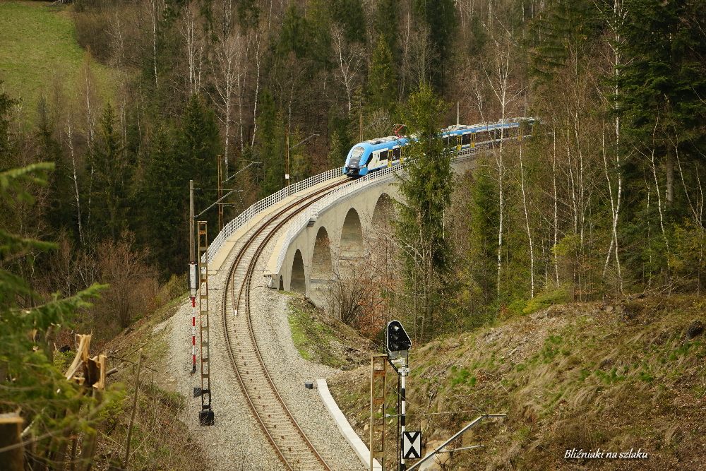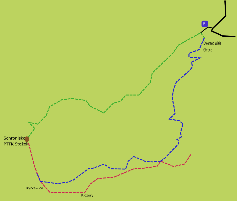 Następnie czeka nas długa prosta w dół, aż do skrzyżowania ze szlakiem niebieskim. Jest tu kilka ławek i szeroka panorama, warto więc zrobić sobię tu chwilę postoju. Przechodzimy na szlak niebieski, którym docieramy po dość długiej wędrówce w dół do stacji kolejowej Wisła Głębce. Przy odrobinie szczęścia można z góry zobaczyć pociąg sunący po ogromnym wiadukcie. Przechodzimy na szlak zielony (na krótkim odcinku schodzi bardzo stromo w dół obok wiaduktu kolejowego) i wracamy na parking.