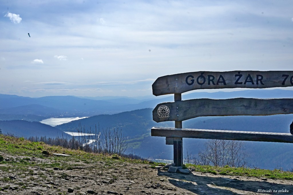 Czeka nas ostatnie podejście na szczyt, szlak wyraźnie prowadzi prosto pod górę. Minąwszy granicę lasu, wychodzimy na otwartą przestrzeń, widzimy już szczyt. Po prawej stronie mijamy ogromną ławkę, na której można zrobić sobie pamiątkowe zdjęcie z pięknym widokiem na jeziora. Dalej na chętnych czeka całoroczny tor saneczkowy i restauracje. Pod szczytem znajdują się startowiska dla paralotni, które z pewnością z ciekawością będą obserwowały dzieci. Startują tutaj też trasy rowerowe. Pod szczytem znajduje się górna stacja kolejki, którą można wyjechać z Międzybrodzia Żywieckiego. Obok, znajdziemy opis roztaczającej się, pięknej panoramy.