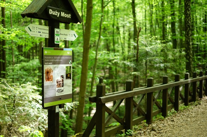 Wędrujemy teraz szlakiem dawnej kolejki wąskotorowej. Co jakiś czas przechodzimy przez mniejsze i większe mostki i mosty, które kiedyś służyły jako kolejowe. Wędrówce towarzyszą ustawione tu tablice informacyjne, które opisują historię kolejki, która niegdyś przebywała tą trasę. Trasa prowadzi szeroką, leśną, zacienioną ścieżką, niemalże płaską. Nasza wycieczka miała miejsce w dość wilgotny, ciepły dzień, po obu stronach drogi utrzymywała się stojąca woda, wobec czego musieliśmy się zmierzyć z latającymi tu komarami. Z tego względu polecamy spacer tym szlakiem raczej wiosną lub jesienią, kiedy owady tak bardzo nie dokuczają. Docieramy do miejsca rozwidlenia szlaków na polanie i miejsca wypoczynku z wiatą i ławami, o nazwie Słupski Weksel. W dniu naszej wizyty można było także tutaj zakupić bilety do ŚPN. Skręcamy za znakami w prawo i kontynuujemy wędrówkę szlakiem kolejki wąskotorowej. Po drodze przechodzimy przez Duży Most, który ma ok. 5 m wysokości, a przez który niegdyś przejeżdżała kolejka wąskotorowa.