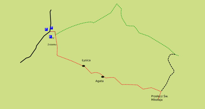 Docieramy do punktu o nazwie Trójkąt, gdzie docierała kolejka wąskotorowa, a gdzie teraz znajduje się miejsce odpoczynku z wiatą oraz skrzyżowanie szlaków. Odtąd przechodzimy na szlak czarny, który doprowadzi nas do Przełęczy Św. Mikołaja. Czeka nas teraz długie na ok. 1700 m, żmudne podejście, dość wąską ścieżką przez las, w okresie deszczowym momentami dość błotniste. Do pokonania aż do przełęczy mamy 187 m przewyższenia. Po trudach wędrówki docieramy do Przełęczy Świętego Mikołaja, gdzie możemy odpocząć i zajrzeć do kapliczki, w której znajduje się figura właśnie tego dobrze znanego dzieciom świętego.