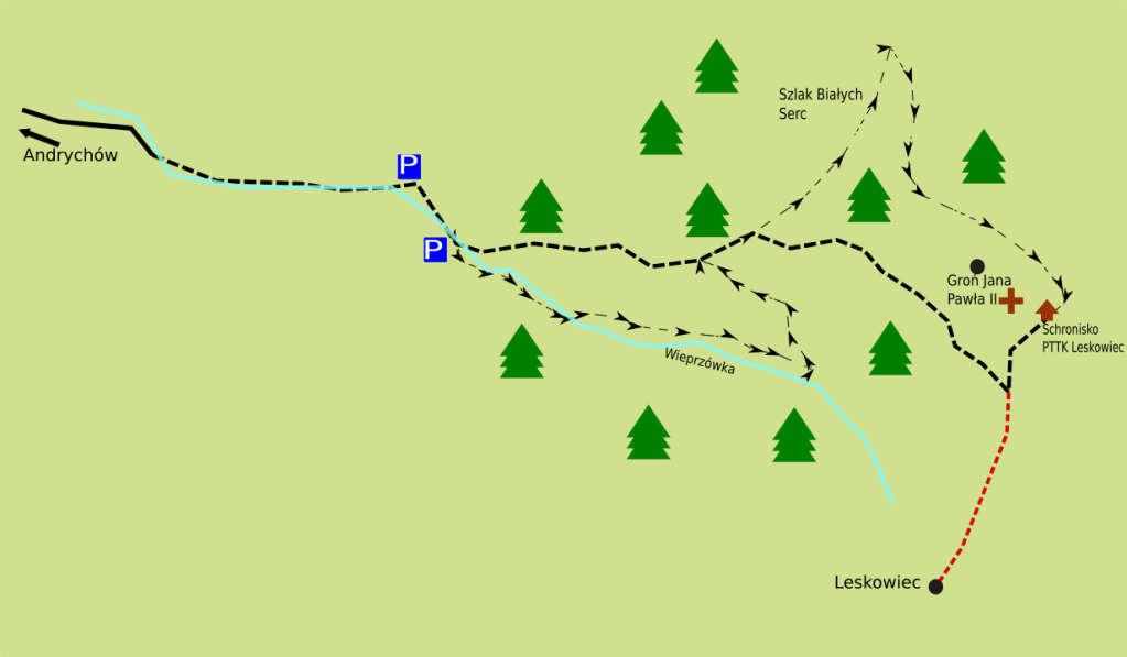Parking: Bezpłatny parking Nadleśnictwa Andrychów (na kilka samochodów), dostępny wg informacji tylko w dni ustawowo wolne od pracy – GPS: 49°47’48.8″N 19°25’32.0″E