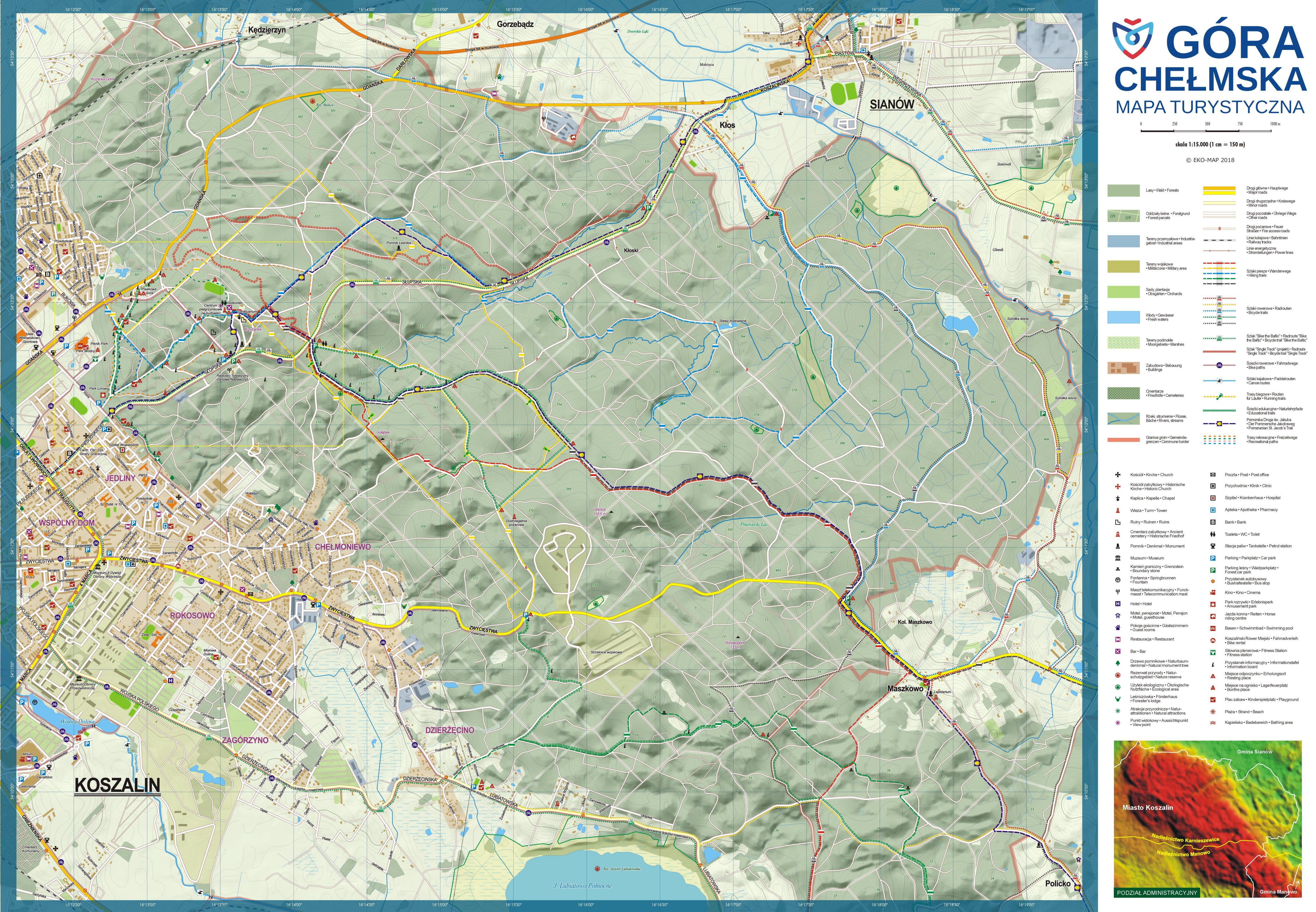 Góra Chełmska, to właściwie spiętrzona morena czołowa, sięgająca wysokości 136,2 m n.p.m. – na tą wysokość wznosi się najwyższe wzniesienie moreny, Krzyżanka. Jest jednak wystarczająca, by nad morzem poczuć się nieco jak w górach. Zbocza pokrywa siatka szlaków, wśród których każdy znajdzie coś dla siebie. Z parkingu przy ul. Słupskiej udaliśmy się najpierw na szczyt Krzyżanki, co można uczynić albo wchodząc przez bramę po prawej od parkingu, a następnie skręcając na długie schody prowadzące w górę, albo wejść w leśne alejki za parkingiem i kierując się drogowskazami wskazującymi na wieżę widokową dojść na szczyt. Znajduje się tutaj ładne, malutkie Sanktuarium Matki Bożej Trzykroć Przedziwnej i wieża widokowa. Na wieżę warto się wspiąć, by zobaczyć rozległą panoramę: zobaczymy stąd Bałtyk i Jezioro Jamno, a także Koszalin i okoliczne miejscowości. Jednakże trzeba przygotować się na trudną wspinaczkę, która nie nadaje się dla najmłodszych dzieci. Początkowo idziemy stromymi, kręconymi, metalowymi schodami. W około połowie wieży zmieniają się one na drewniane schodki, już nie kręcone, ale jeszcze bardziej strome. Ostatni odcinek to już właściwie drabinka, z trzema ostatnimi, bardzo nieprzyjemnymi półstopniami, pionowo w górę. Po obejrzeniu widoków na szczycie, musimy zejść tymi stromymi schodami w dół, co jest jeszcze większym wyzwaniem niż wspinaczka w górę… Wstęp na wieżę jest płatny, w 2022 r. : 3 zł za bilet ulgowy i 5 zł za bilet normalny (dzieci do lat 3 bezpłatnie, ale raczej nie poradzą sobie z samodzielnym wyjściem na górę). U stóp wieży widokowej budowane jest centrum pielgrzymkowe.